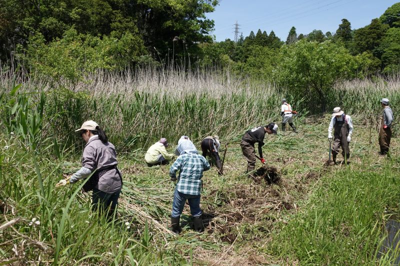 この日の作業は、7月26日に行われる夏休み特別企画『川遊びの会』の会場つくりです。梅雨明け宣言が出てかなり暑くなるとの予想のため、作業時間を朝7時~9時としました。これは大正解でした。 開発が絡み、ほとんどの行事ができなくなった下大和田YPP田んぼ。その裏を流れる水路が会場なのですが、手つかずの川の周辺や川の中は、アシやマコモ、ショウブなどが入りこみ、威勢よく伸び放題になっていました。このままでは川遊びなどできません。まずは刈り払い機3台で川の周辺の草を刈り取りました。刈り払い機の威力は凄まじく、30分しないうちに予定地の刈り取り終了。10分ほど休憩&水分補給をして、次の作業は川中に入ってアシやマコモの刈り取りです。これは鎌を使った手作業でした。刈りとった草を除去するのは3人の女性たちです。川の中に入ることもなく、大変暑かったと思います。9時までに予定地すべて終了しました。こんな暑い中の作業でしたが、これほどビフォアーアフターがはっきりする作業は珍しく、気分は爽快でした。 参加者7名(大人7名) 報告 平沼勝男