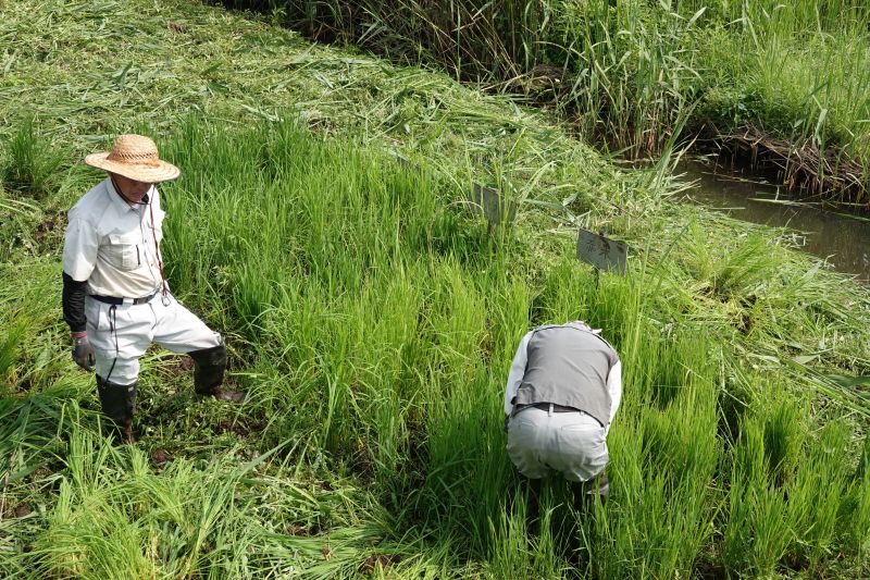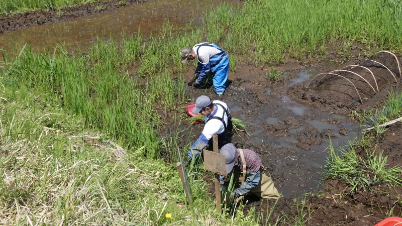 この日は参加スタッフが少なく、小さなお子様もいたことから自然観察的な内容にしました。 スタートはウシガエルの罠の確認です。4つの罠(アナゴかご)を見て回りました。ウシガエルは入っていませんでしたが大きなザリガニやクサガメが入っていたので、子どもたちは喜んでいました。アメリカザリガニの♂♀の見分け方や、クサガメとほかのカメとの違いなどの説明がスタッフからありました。 雑草に覆われている田んぼですが、一部に水面はあります。ここでミナミメダカやオオタニシを採捕。シオカラトンボも捕まえて観察。貴重種であるオオイトトンボが盛んに交尾、産卵をする姿があり、その説明がスタッフからありました。 復田中の稲の様子を見に行きましたが、誠に残念なことになっていました。2週間後に収穫予定だった農林1号や山形はえぬきはほとんど実がついていなく、しかも倒伏しています。収穫などできる状態ではありませんでした。実がついていないのはスズメの食害と思われます。ほとんど取られています。倒伏の原因は稲の分けつが不十分だったためだと思います。生育方法に間違いがあったようです。 参加者5名(大人3名、小学生1名、幼児1名) 報告 平沼勝男