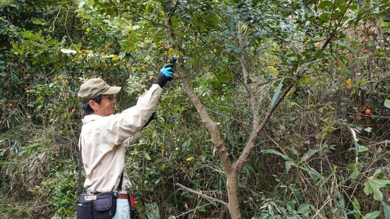 少しは涼しくなったかに思われましたが、作業をすると汗が噴き出てきました。下大和田の小さな畑で、収穫期を終えたミニトマトを片づけました。次に植える作物のために雑草を抜いて耕し、苦土石灰や有機化成肥料をまきました。傍らでは、ワタが実をつけ始め、ヒャクニチソウやラベンダーが花を咲かせています。ヒャクニチソウの花とレモングラスをお土産にいただきました。 復田した田んぼでは、緑米と赤米が実り始めていました。昨年は実った米がスズメの餌になってしまい、収穫できませんでしたので、今年はスズメに奪われないために、防鳥ネットを張りました。足場の悪い中での作業はなかなか大変ですが、今年は下大和田産のお米でもちつきができそうです。 その後、森の中を皆で歩き、散策路をどのように造るか相談しました。サンショウやニガキの実がなり、クロモジやハナイカダを確認しました。キクラゲも出ていたので、皆で収穫しました。森の豊かな恵みを感じます。 参加者10名 (大人9名、小学生1名) 報告 高橋久美子