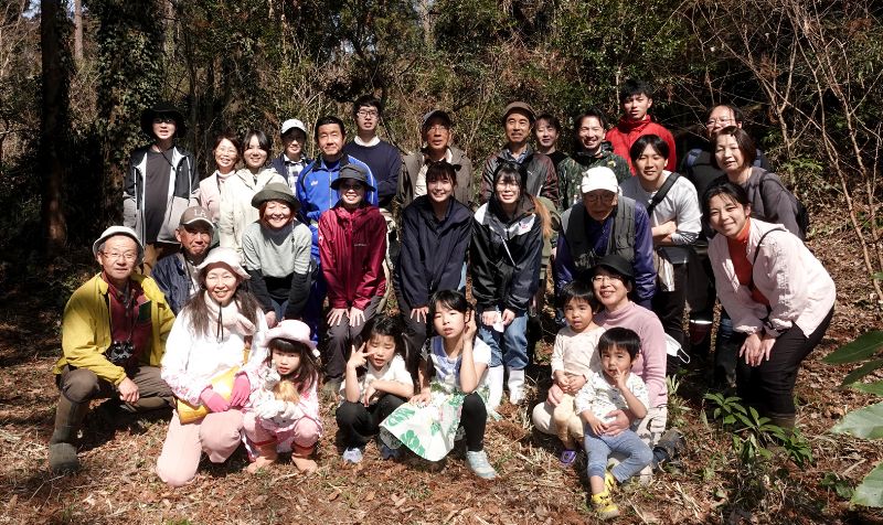 開発問題もあって、米づくりができない春を迎えました。谷津田に苗床はありませんが、ニホンアカガエルのオタマジャクシやメダカなどは、いつものように活動しています。開発計画による影響で歩けなくなった場所もありますので、今回の観察は森を中心に道沿いの生きものを見つけながら歩くことにしました。 森の中では、ウラシマソウやミツバツチグリなどが咲き始めていました。アオキの雄花と雌花の違いを観察したり、メジロの古巣を見つけてその精巧な作りに参加者一同感心しきりでした。雨上がりだったこともあり、田んぼからはシュレーゲルアオガエルの大合唱が聞こえ、大型カタツムリのミスジマイマイが姿を見せていました。シュンランやウグイスのさえずりにも春の訪れを感じることができました。最後に記念写真を撮影して解散となりました。 参加者14名(大人10名、大学生4名)