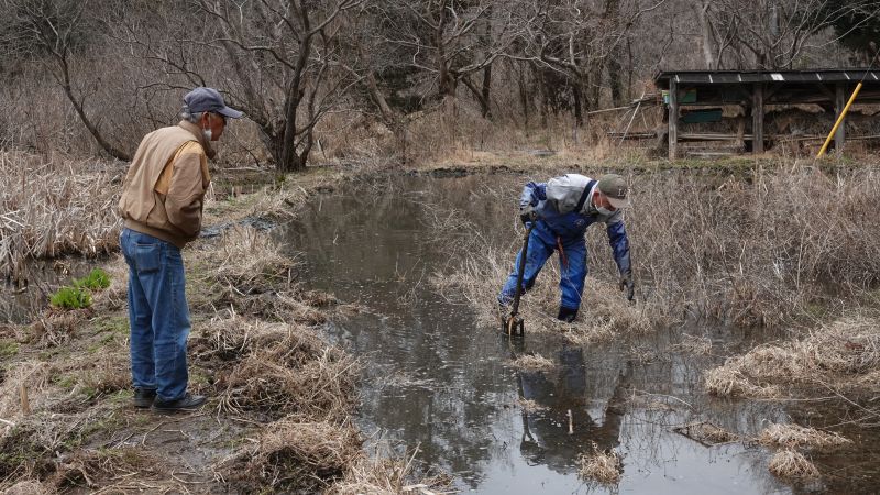 季節が戻ったように寒い日になりました。太陽が出ていないためかなお更そう感じます。そんな中でも元気に作業をしました。復田作業はこの日は3名。2人はいつもながらのアシの根との格闘です。スコップで横に伸びた根を切り、燃料ポンプの水圧で泥を飛ばして除去します。もう1人は畔作りをしました。畔ができるとがぜん田んぼらしくなります。今後、イノシシにやられてもいいように畔の上に板を敷きたいと考えています。復田した面積は予定した田んぼの3分の2にくらいになりました。今年のお米つくりはこの面積でも良いと思いました。最低ラインをクリアしたというところでしょうか。 もう一方の作業として森の手入れをしました。不要な草木の除去です。作業後はすっきりした良い森になりました。倒したコナラがあるので、その木を利用してシイタケ栽培をする予定です。そのための榾木(ほだぎ)作りも始めました。しかしチェンソーの調子が悪く、次の機会に持ち越しとなりました。 田んぼにはアカガエルの卵塊が増えていました。この数日で20個以上増えました。それでも今年はどういうわけか壊滅的に数が少ないです。水環境を守るため畔の補修をし、田んぼに水を入れました。これからも水が枯れることがないように、大事にアカガエル達を守っていきます。 報告;平沼勝男 参加者7名(大人5名、大学生2名)