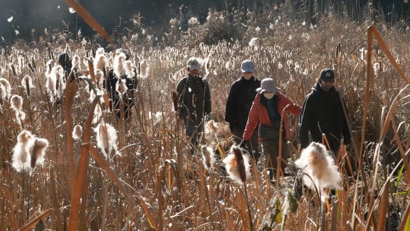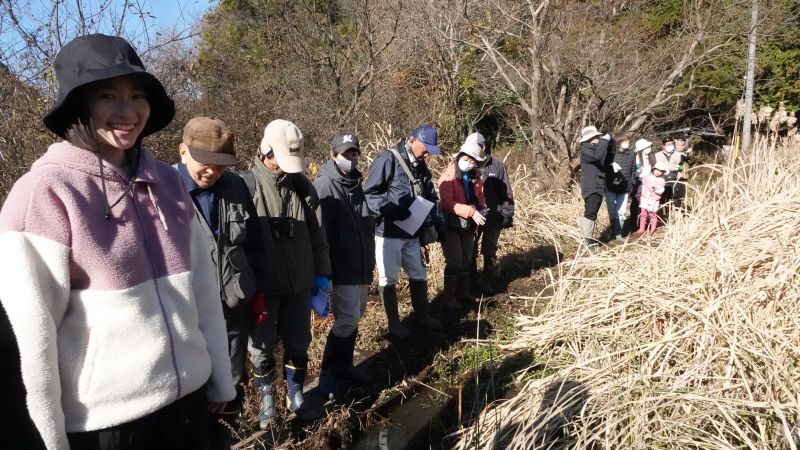 朝から冷たい小雨の中、6人が集まりニホンアカガエルの卵塊調査をしました。例年2月の観察会は、ニホンアカガエルの卵塊調査をメインテーマに実施してきました。今年は今までとは大きく環境が変化しています。それは開発問題が具体的に動き出したため、昨年は米づくりができずに田んぼが荒れ放題となってしまったことです。夏は雑草で覆われてしまい、わずかに水面が見えるくらいの谷津田が広がっていました。今の季節は植物も枯れて、水面が広く見られる場所もありますが、果たしてニホンアカガエルは産卵してくれているでしょうか。 YPP田んぼ、マイ田んぼ、復田している田んぼ、下流部の鉄塔下の水辺を丹念に観て歩きましたが、ニホンアカガエルの卵塊を見つけることができませんでした。少雨など季節的なものなのか開発の影響なのかははっきりしませんが、調査を継続していこうと思います。 参加者5名(大人4名、大学生1名)