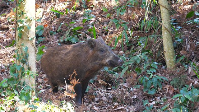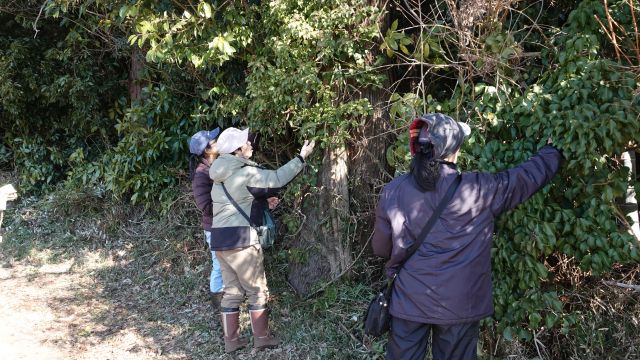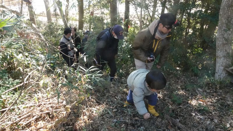 本日の観察会は、全国的な大寒波と渇水によって、いっそう冬枯れがすさまじく、全体的に生きものの気配があまりしない雰囲気でした。まず、旧YPP田んぼと今年復田した田んぼを廻り、水辺を行き来する小鳥たちを観察しました。 畑の様子を見に行った後、斜面林を登って、タラの芽を伐採した明るいエリアからコナラを残している明るいエリアを歩きました。ふと、コナラの幼木が密集しているところを眺めていたら、視界の端に大型犬ほどの大きさで、濃げ茶色の動物がいた気がしました。いや、こんなところにイノシシがいる訳がないと思ってよく観察したら、イノシシでした。 その後、シダ植物が生えている場所に降りる階段に現れ、みんなで遠巻きに観察しました。コナラ林と階段で見たイノシシは大きさが違ったような気がしたため、もしかしたら親子連れだったかもしれません。田んぼでイノシシが出たことはあっても、山に出たのは初めてということでした。 参加者13名(大人8名、大学生2名、高校生1名、小学生1名、幼児1名)