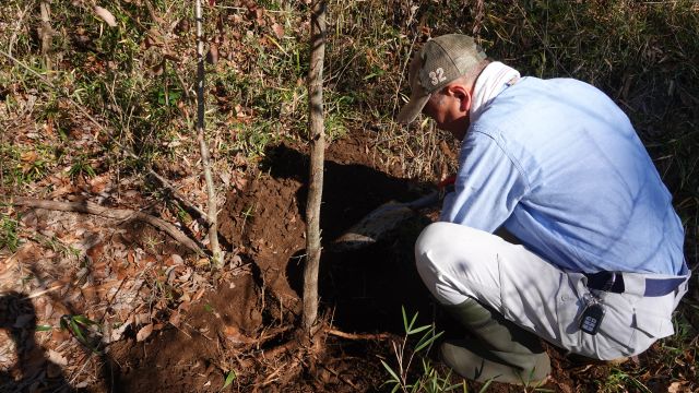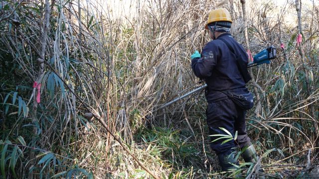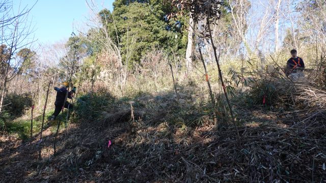 冬らしく晴れ渡り、気持ちのよい空のもと、先週に引き続き「リスが住みたくなる雑木林」を目指し、タラの木広場周辺で森の整備を行いました。 刈り払い機(2機)や切り鋏を使用し、過度に繁殖し、育成対象樹木の芽や幼木の生育を阻害しているヌルデやアカメガシワ、ササの下刈りを行うとともに、鋸を使って樹木の除伐を実施しました。これにより、リスの食料となるクルミや栗の芽、幼木に十分な日光が届く環境を整えることができました。 また、伐採したヌルデやアカメガシワは、子どもたちと一緒に運び、森の中の道の目印として活用しました。寒さの厳しい時期ではありますが、心地よい日差しのおかげで、森の中での作業はとても気持ちよく感じられました。 小学1年生と年少の子どもたちは、それぞれ 「自然観察会用に道を作った!」 「笹の葉が手袋にくっつくのが不思議だね」 などと話しながら、自分にできることを見つけ、新しい発見を重ねつつ、整備中の森の中で生き生きと活動していました。 帰宅後には、2年前に下大和田でキツネが確認された際のニュース映像(田中さんが取材を受けている様子)を家族で鑑賞しました。日頃お世話になっている方がテレビに映る姿を見て皆で盛り上がるとともに、子どもたちが本活動に良い刺激を受けていることを感じました。 キツネ動画の再生数から、多くの方に関心を持っていただいていることが分かり、谷津の重要性を広く認識していただくためには、継続的なモニタリングが重要であると実感しました。一方で、モニタリングにはデータ確認や機器設置などの負担が大きいことも伺っており、今後AI等の技術を活用した支援の可能性についても模索していきたいと考えています。 参加者12名(大人8名、大学生1名、小学生2名、幼児1名) 報告:石井健登