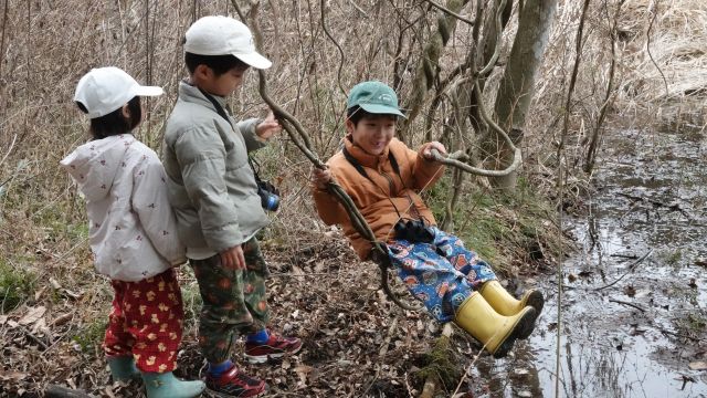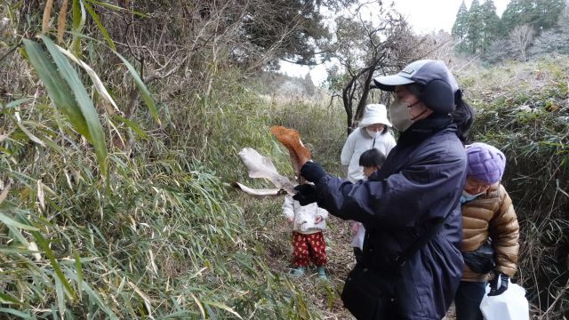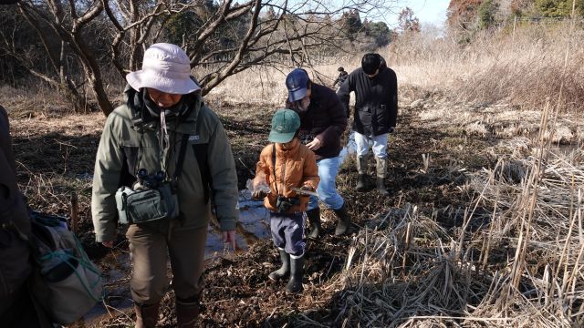 1月は生きものたちにとって命の危機にさらされる季節でしょう。草花の多くは地上部を落とし、種や地下部を残して冬を乗り切ります。昆虫たちは卵を残したり、土や木の中に潜んだりしてやり過ごしたりします。淋しい季節かと思いきや、この時期にだけ観られる生きものがいます。アオジやカシラダカ、ツグミなど冬鳥と呼ばれる鳥たちです。シジュウカラやエナガ、メジロなどの小鳥たちが「混群」を作ってにぎやかに現れるのもこの季節です。 今日は冬鳥を求めて、鹿島川合流部まで真冬の谷津を散策しました。強風が吹き荒れていた影響か、アオジやカシラダカがちらほら姿を見せる程度で、期待したほどではありませんでした。それでも参加者たちは、マムシグサの仲間のサツマイモやカボチャのような塊茎を見つけて興味津々。壊れそうな橋を渡ったり、水辺に張り出したフジヅルのブランコを楽しんだりと、ちょっとした探検気分で冬の谷津を満喫しました。 参加者18名(大人12名、大学生1名、高校生1名、小学生3名、幼児1名)
