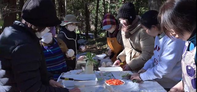 毎年、最初のイベントと言えばどんど焼きでしたが、昨年はお米つくりをしていないことから、今年はお餅つきだけにしました。場所も今までとは違い、東屋やブランコのある森の中。火をたく場所だけは安全管理上すぐ下の道路の上。コンパクトですが使い勝手の良いお餅つき会場になりました。 3つのかまどを用意。火をつけて湯を沸かしてもち米を蒸し、野菜たっぷりの味噌汁をつくりました。もち米は約4升を用意。2回に分けて蒸しあがる順にお餅つきをしました。食べ方はあんころ餅、きな粉餅、磯辺焼き、大根おろし、刻んだねぎの入った納豆、どれも美味しかったです。つきたてのお餅は良いものですね。野菜たっぷりのお味噌汁も大好評でした。野菜はたくさんのご寄付がありました、これもありがたかったです。 参加者30名(大人22名、大学生1名、高校生1名、小学生2名、幼児4名) 報告:平沼勝男