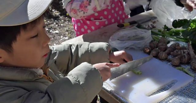雨天の為1日順延となりました。前日は朝から雨でしたがこの日は曇り空。風もなく暖かく、野草を食べる会には適した日になりました。順延の為か少なめの人数でしたが、気心の知れた少人数も楽しいものです。採った野草はノビル、ヨモギ、ミツバ、カラスノエンドウ、オオバコ、セリ、ニワトコなどです。温暖化と言われる割には例年に比べヨモギやミツバの葉は小さく、ツクシは1本もありませんでした。ここ2週間寒い日が続き、桜の開花が遅れたように、野草たちも出る日を送らせているようでした。その日の朝に収穫したシイタケもありました。 調理は天ぷらです。薪ストーブで温めた油で揚げます。湯がいたノビルの酢味噌和えもありました。どれもがおいしい春の味わいでした。 参加者18名(大人13名、大学生2名、小学生2名、幼児1名) 報告者;平沼勝男