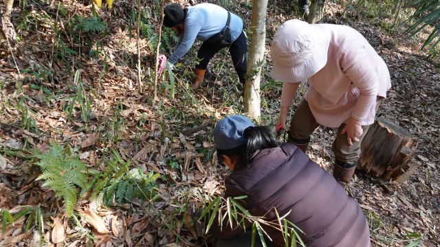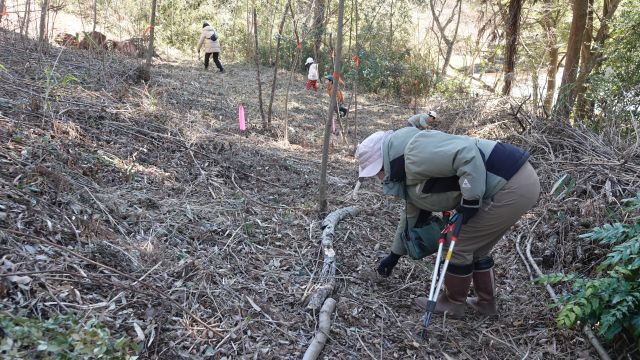6日前の日曜日に下草刈りをしました。今日は、その後の続きの作業を行いました。動きやすい季節に、やれるだけのことをしておきたいものです。 枯れかかり倒木の危険がある木は、市が伐採することになりました。立ち入り禁止にした危険エリアを避けて、台地に上がれるように道筋を整えました。 以前、大規模に樹木が伐採された後、トモエソウが繁茂した場所がありますが、その後樹木がうっそうと生い茂り、林床に光が届きにくくなったため、トモエソウの群落は見られなくなってしまいました。今回はそのあたりの樹木を切り、つる植物などを取り除き日光が林床に届くようにしました。またトモエソウが生えてくることを期待します。 このような地味な作業は、一見つまらないと思われるかもしれませんが、やってみると結構、達成感があります。また、クモなどの小さな動物や勢いのある植物たちに囲まれて何とも言えない癒しを感じて、幸福感に満たされます。小さな生き物が一生懸命に生きている姿を見て、私も日々を大切に生きていきたいと思います。 午後は新しく造った台地上の畑に、玉ねぎの苗とニンニクを移植しました。 参加者9名(大人8名、幼児1名) 報告 高橋久美子
