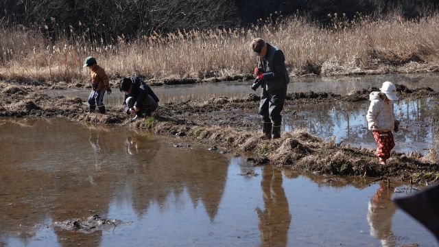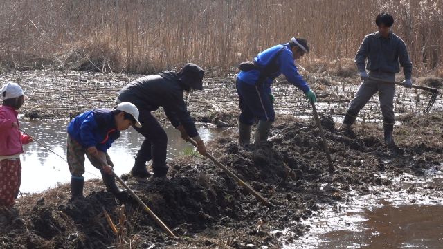 週間天気予報ではこの日から厳しい寒さになるとの予報でした。しかし当日は日が照り、風もなく、作業をするとうっすら汗をかく程度。ちょうど良い天気と言えたでしょう。この日の作業は3回目となる復田です。前回ポンプを持って行かないという失態の反省から、この日はポンプが大活躍することとなりました。アシの地下茎の除去がテーマなのでポンプの水圧を地下茎にぶつけ泥を飛ばし、取り出します。レンコンの収穫方法と同じです。しかし実際にはそう簡単ではありませんでした。まず泥が深い。膝上まである丈の長い水田用の長靴を履いていても、泥水は長靴の中に入ってきました。長靴が泥から抜けなくなるスタッフもいました。地下茎が深いところでつながっていることが度々あり、都度スコップで分断ました。泥深い中でこの作業は重労働でした。しかし作業を続けることで、だんだんと田んぼらしい状態になってくるのが分かるので、その点は楽しかったです。何より気心の知った仲間とする作業は良いですね。 報告 平沼勝男 午前中は復田作業を行いました。膝上まで泥で埋まりながら、肘の上まで泥の中に腕を突っ込んでアシの根を探して引っこ抜くサ票を繰り返しました。作業を始めたばかりの時は気温も低く、泥が冷たくてすっかり体が冷えきる思いでしたが、正午に近づくにつれて日差しが出て暖かくなり、救われました。午後は森の手入れで、観察路の一画のアズマネザサを刈り、点在するように生えていた木本も切りました。小さな広場のような空間が出来上がり、作業終了後に記念撮影をしました。 報告 鈴木郁也 参加者7名(大人6名、大学生1名)