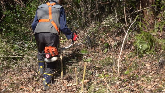はじめの一時間は刈払い機三台で草刈りを行い、東屋の後背地の台地の上は繰り返しの手入れでだいぶさっぱりと見映えのよい景色となりました。作業終了後、お楽しみとして「タラの芽のふかし」をしました。 タラの芽は山菜の王様とも呼ばれ、おいしい山の恵みとして有名です。リボンをつけて残されたタラの木を、大人の肩あたりで切り、伐採した先の木を15cm間隔で芽を残すようにして切り分けていきます。そして、芽の生える方を上にして水の張った入れ物に立てれば完成です。水換えなど、きちんとお世話をすれば1~2ヶ月後には芽が出はじめるそうです。山菜のお世話を通して植物の生命力に触れることも、自然と親しむ一つの方法ではないでしょうか? 参加者13名 (大人8名、大学生1名、高校生1名、小学生2名、幼児1名) 報告:鈴木郁也