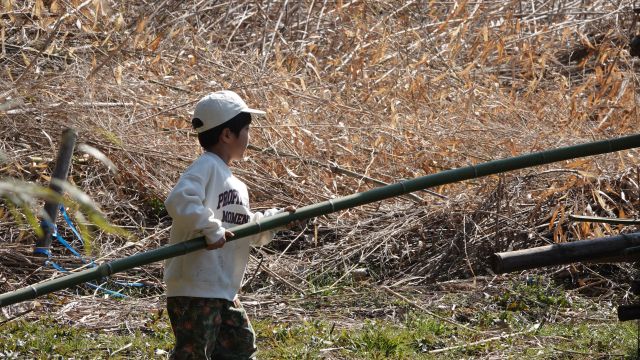 この日は復田している田んぼの正面にある森の手入れを行いました。マダケを切り倒して運び出し、充分に太く強度のあるものは枝を落としておだ小屋に収めました。マダケを切ったあと、刈払い機で周辺のアズマネザサ・アオキを伐採したら、人が休むのにちょうど良さそうな明るい空間が生まれました。 午後は、森にある材料を使ってリースづくりをしました。 参加者11名(大人8名、大学生1名、中学生1名、小学生1名) 報告:鈴木郁也