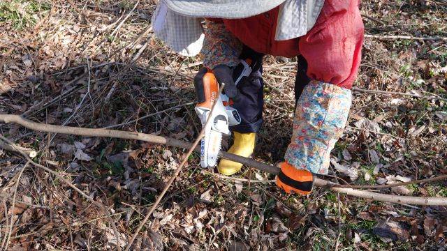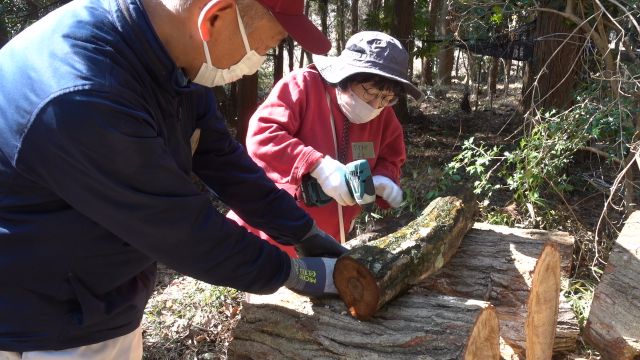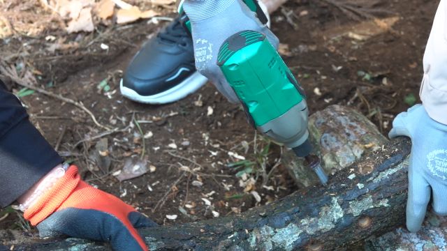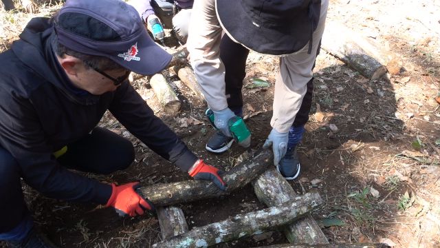 前回、キノコの植菌を行ったのは、2022年2月でした。今でも、そこからときどきシイタケが生えてきます。3年ぶりにまた植菌しようと計画しました。 市に枯れかけた樹木の伐採を依頼したので、切られた木を適当な長さに切り、ほだ木にすることにしました。ところが、伐採作業が遅れて、私たちの植菌作業が3月中旬になってしまいました。 ようやく、3月初旬に伐採されたコナラを、9日に水に浸けました。コナラがシイタケのほだ木になります。電気ドリルで穴をあけて種菌を埋め込みます。今回の種菌は、前回のものより大きく、木槌を使う必要がなく、指で押し込むタイプでした。穴あけの作業は、電気ドリルの充電が切れたり、危険もともない、注意が必要でしたが、種菌を植えるのは楽しい作業でした。小さな子どもたちも、喜んで参加しました。早ければ今年中にシイタケが生えるそうです。食べるのが、今から待ち遠しいですね。 参加者14名(大人10名、大学生1名、小学生1名、幼児2名) 報告:高橋久美子
