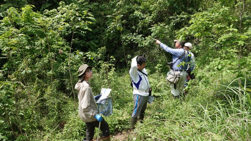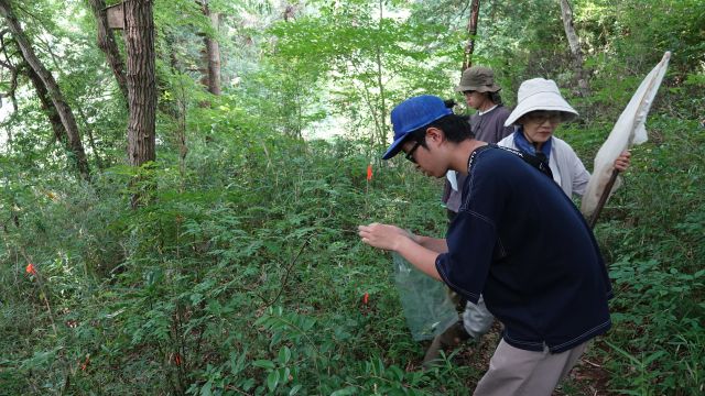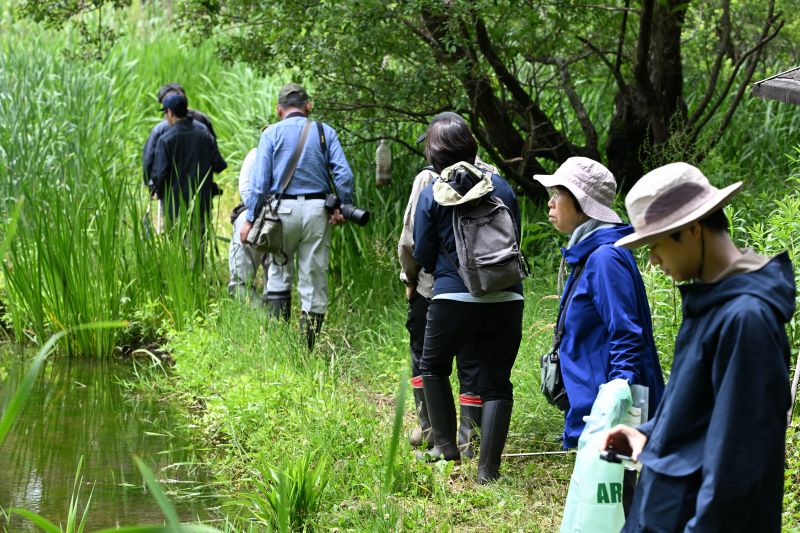 この日もうだるような猛暑でしたが、生い茂る緑の間にさまざまな昆虫が見られました。ノコギリカミキリやキマダラコガネムシのほか、アカボシゴマダラ(特定外来生物)が見られました。シオカラトンボもよく見られましたが、せわしなく飛び回ってじっと近くで観察することは難しく、一方キイロイトトンボは一度葉っぱに停まるとしばらく動かないので、みんなでじっくり観察することが出来ました。同じトンボでも、種類が違えば性格にも違いがあるのが、生きものの面白いところだなと改めて感じました。      参加者9名(大人6名、大学生2名、小学生1名)      報告 鈴木郁也