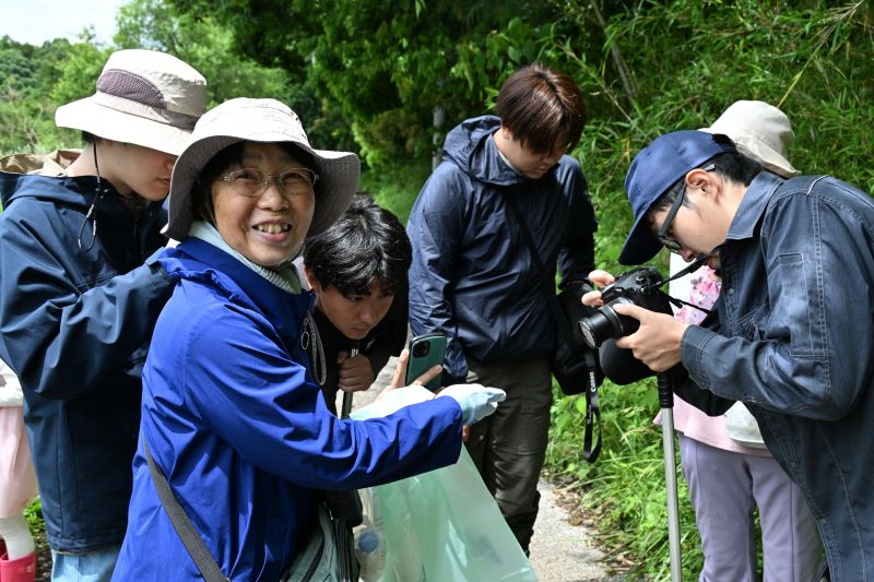 開発問題もあって、米づくりができない春を迎えました。谷津田に苗床はありませんが、ニホンアカガエルのオタマジャクシやメダカなどは、いつものように活動しています。開発計画による影響で歩けなくなった場所もありますので、今回の観察は森を中心に道沿いの生きものを見つけながら歩くことにしました。 森の中では、ウラシマソウやミツバツチグリなどが咲き始めていました。アオキの雄花と雌花の違いを観察したり、メジロの古巣を見つけてその精巧な作りに参加者一同感心しきりでした。雨上がりだったこともあり、田んぼからはシュレーゲルアオガエルの大合唱が聞こえ、大型カタツムリのミスジマイマイが姿を見せていました。シュンランやウグイスのさえずりにも春の訪れを感じることができました。最後に記念写真を撮影して解散となりました。 参加者14名(大人10名、大学生4名)