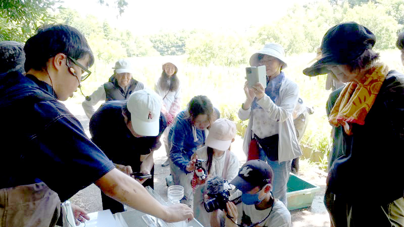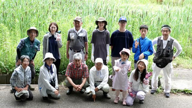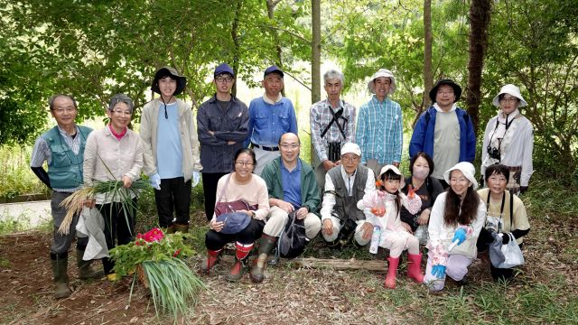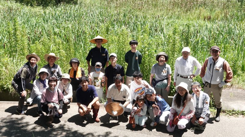 1898年以降で最も平均気温が高くなった7月でしたが、この日も猛暑の予報が出ていました。初めに水分補給などの注意点を話した後畑に行きミニトマトを収穫し、谷津田での生きもの観察となりました。 米づくりをしていない田んぼは、先月にもましてヨシやヒメガマなどの湿生植物が繁茂していましたが、トチカガミやタコノアシなどの貴重な植物は健在で、オオイトトンボが舞いミナミメダカも元気に泳いでいました。森に入ると暑さも少し和らぎ、木陰のありがたさをひしひしと感じました。最後に集合写真を撮影し、盛夏の観察会を終了しました。 参加者15名(大人9名、大学生2名、高校生2名、小学生1名、幼児1名)