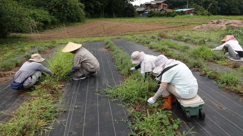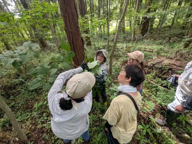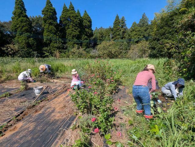 少しは涼しくなったかに思われましたが、作業をすると汗が噴き出てきました。下大和田の小さな畑で、収穫期を終えたミニトマトを片づけました。次に植える作物のために雑草を抜いて耕し、苦土石灰や有機化成肥料をまきました。傍らでは、ワタが実をつけ始め、ヒャクニチソウやラベンダーが花を咲かせています。ヒャクニチソウの花とレモングラスをお土産にいただきました。  復田した田んぼでは、緑米と赤米が実り始めていました。昨年は実った米がスズメの餌になってしまい、収穫できませんでしたので、今年はスズメに奪われないために、防鳥ネットを張りました。足場の悪い中での作業はなかなか大変ですが、今年は下大和田産のお米でもちつきができそうです。  その後、森の中を皆で歩き、散策路をどのように造るか相談しました。サンショウやニガキの実がなり、クロモジやハナイカダを確認しました。キクラゲも出ていたので、皆で収穫しました。森の豊かな恵みを感じます。        参加者10名 (大人9名、小学生1名) 報告 高橋久美子