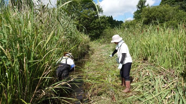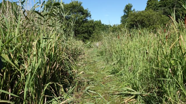 8月27日下大和田谷津田にて、人生初の刈払い機で草刈りをしました。いつもの観察会コースは、今年お米作りが出来なかったことで、植物が人の背丈ほどに伸びて鬱蒼と茂り、畦と田んぼの区別がつかない場所もありました。ふと気づけば、畦道から外れて田んぼの中に立っていたこともあり、たった一年足らずで環境を激変させてしまう植物の生命力に改めて畏怖しました。 刈払い機講習以来、本格的な作業は初めてで、いざやってみると「つらい、大変」よりも「あぶねえ!」という思いが頭の中で巡っていました。泥田で身体を動かすお米づくりも大変ですが、それとは別種のつらさ・難しさだと感じました。  これらの作業を通して、草刈りは里山保全のかなりを占めるだけでなく、業務に携わる方々との信頼にも関係があると考えたので、今後外部で活動する機会にも積極的に草刈りの手伝いを申し出ようと思いました。 報告:鈴木郁也