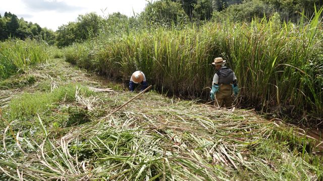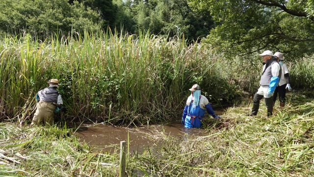 この日の作業は、7月26日に行われる夏休み特別企画『川遊びの会』の会場つくりです。梅雨明け宣言が出てかなり暑くなるとの予想のため、作業時間を朝7時~9時としました。これは大正解でした。 開発が絡み、ほとんどの行事ができなくなった下大和田YPP田んぼ。その裏を流れる水路が会場なのですが、手つかずの川の周辺や川の中は、アシやマコモ、ショウブなどが入りこみ、威勢よく伸び放題になっていました。このままでは川遊びなどできません。まずは刈り払い機3台で川の周辺の草を刈り取りました。刈り払い機の威力は凄まじく、30分しないうちに予定地の刈り取り終了。10分ほど休憩&水分補給をして、次の作業は川中に入ってアシやマコモの刈り取りです。これは鎌を使った手作業でした。刈りとった草を除去するのは3人の女性たちです。川の中に入ることもなく、大変暑かったと思います。9時までに予定地すべて終了しました。こんな暑い中の作業でしたが、これほどビフォアーアフターがはっきりする作業は珍しく、気分は爽快でした。  参加者7名(大人7名)  報告 平沼勝男