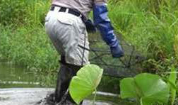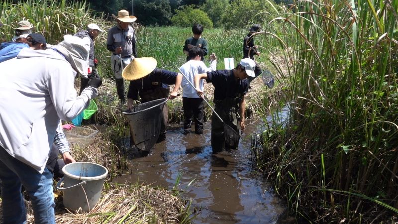 参加者は普段から谷津田に来ていただいている人たちでした。そしてこの日はボランティアが6名来ていただきました。中学生、高校生、大学院生、そして社会人。皆さん下大和田は初めてでしたが、皆自然好きの人たちでした。スタッフもフレッシュな人たちの参加で楽しむことができました。魚の取り方の説明がスタッフからあり、ここからスタートです。参加者とボランティアの皆さんがたも網を手に川に入りました。あいにく川の方は流れが悪くは泥が堆積し、水位も低いためか捕れる生き物が少なかったです。しかし川の水は冷たくて気持ちが良く、みな夢中で魚やエビを捕っていました。 前後合わせて一時間の魚捕りが終わるとスタッフからこの日捕えられた生き物の説明がありました。そして最後は恒例のザリガニの塩ゆでです。初めてザリガニを食べる人が多く、最初は慎重に口に入れていましたが、おいしさがわかると笑顔がこぼれました。 参加者20名(大人13名、大学生1名、高校生2名、中学生2名、小学生2名)  報告 平沼勝男
