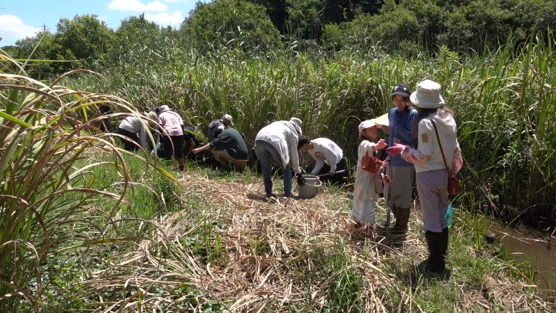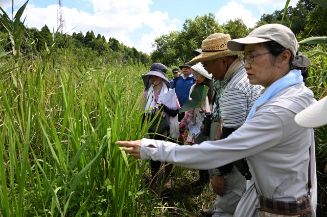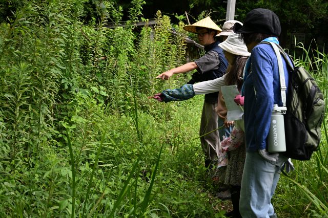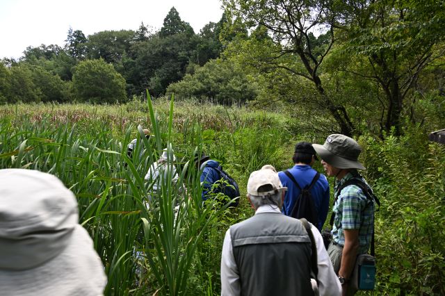 昨年は台風10号の影響で、9月1日実施予定を1週間遅らせて観察会を実施しました。今年も台風15号が9月5日に千葉県を通過しました。二百十日や二百二十日が台風の上陸しやすい「農家の厄日」と言われてきましたが、昔の人は自然との距離が近かったと感じます。そんなことを思いながら、初秋の花やトンボを探しながら谷津と森を散策しました。 米づくりができなかった谷津田はヨシやガマで覆われていましたが、開けた水面には今年生まれた小さなメダカが群れ、上空をギンヤンマやシオカラトンボが盛んに舞っていました。シオカラトンボがオオカマキリに捕食されている光景を目にしました。事前に仕掛けておいたウシガエル用の罠を引き上げると、4尾のアメリカザリガニが入っていました。平沼さんがガマの地下茎を掘り上げて、皆さんに見せてくれました。 森の中では同じ枝に止まっているアオバハゴロモやベッコウハゴロモの成虫と幼虫をじっくり観察しました。10尾ほどのヤマトアシナガバチが葉に群れていましたが、巣作りではないでしょうか。アキノノゲシやフジカンゾウの花が盛りで、暑いながらも秋が感じられた観察会になりました。      参加者16名(大人11名、大学生4名、小学生1名)