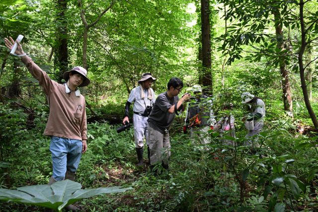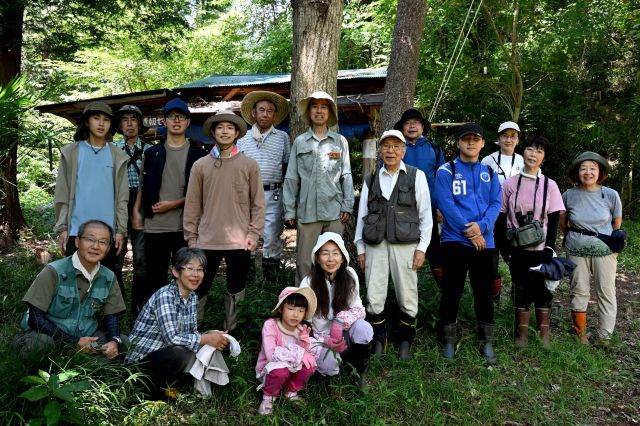 5月、下大和田の谷津田と森は、一年で最も鮮やかな緑で覆われます。残念ながら休耕田と化した田んぼ一面ヒメガマやヒシで覆われてきて、水面はわずかに残っているだけでしたが、その中でもミナミメダカが群れで泳いでいました。水路際にはショウブが繁茂し、皆で葉をもんで匂いをかいでみました。ヤマサナエやシオヤトンボが本格的な春の訪れを教えてくれます。 林床では、ウラシマソウに変わってマムシグサが出現、フタリシズカやキンランが群落を作っていました。特にキンランは1か所で25株生えているところがあり、木漏れ日の中で黄色い花が鮮やかに輝いていました。 集合写真を撮影した後、スズメバチ用のトラップ14個を皆で協力して設置しました。この時期女王バチを捕えておくことは、スズメバチに刺される被害を抑えるために重要な作業です。 参加者16名(大人9名、大学生5名、小学生1名、幼児1名)