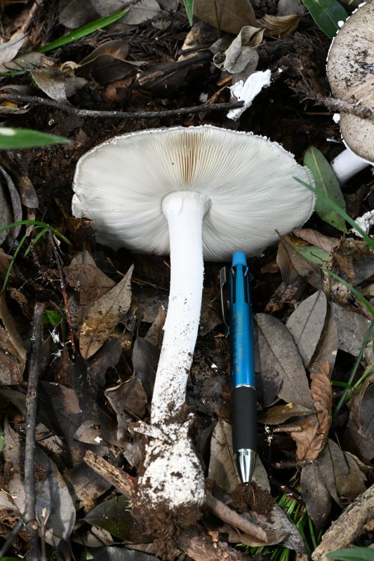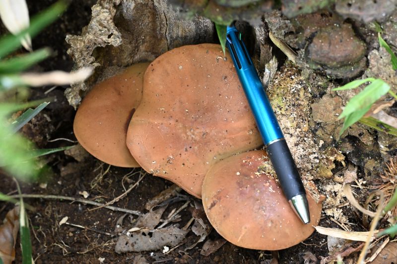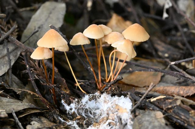 10月に入っても気温の高い日が続いています。春と秋を1か月ずつ減らし、夏を5か月にして「初夏・盛夏」とする「五季」という言葉も生まれました。しかし、見上げると空は高く一面のいわし雲。キンモクセイも香りだし、季節は確実に進んでいることに気づきます。このとこのところの雨の影響かどこへ行ってもキノコが目立ちます。この日もたくさんのキノコに出会うことを期待して、谷津田と森を歩きました。 最初9月28日に草刈りをした谷津田の畦を歩きました。放棄された田んぼの畦のわきでタコノアシが花を咲かせ、一部は紅葉していました。森の入り口で、高さ2mほどの木の枝に引っかかっているアオダイショウの脱皮殻を見つけ、平沼勝男さんが棒を使って採取しみんなで観察しました。脱皮殻から見て体長1.5mを越えているようでした。 森に入るとたくさんのキノコが生えていました。何種類ものキノコを見つけましたが、種名が分からないキノコも多く、帰宅して千葉県立中央博物館の吹春俊光さんに写真を送って同定をお願いしました。写真だけで種を特定することは難しいですが、テングタケやオチバタケ、イグチの仲間が多かったようです。地面から少し離れたところでは、シラヤマギクの白い花やミズヒキの赤い花などが彩を添えていました。最後に記念写真を撮影して観察会を終えました。   参加者17名(大人13名、大学生2名、高校生1名、小学生1名)