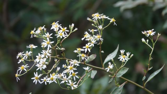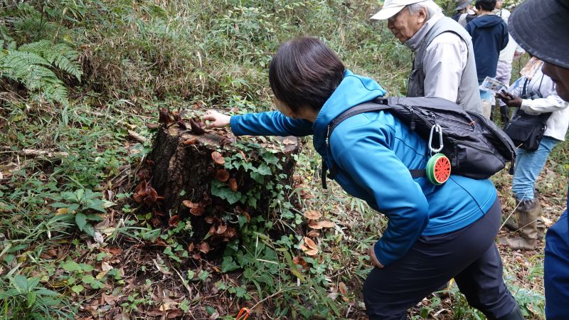 <観察路の整備>  セイタカアワダチソウが黄色い花を咲かせ始め、 谷津田もようやく秋らしい風情になりました。森の中はにぎやかで、植物のパワーに圧倒されるようです。木の幹や、落ちた枝、または地面から多種多様なキノコが生えています。「これ食べられるかな?」と聞くと「そればっかり聞くよね?」と嫌がられています。アズマネザサは切っても切っても生えてきます。チヂミザサは今が盛りでしょうか?ねばねばする花穂をたくさんつけています。タケニグサは果実をつけ、クワはそこここにはびこっています。フユイチゴが実をつけ始め、ヤマイモのムカゴが垂れ下がってきました。散策路を少しでも整備しようと、植物を刈りこみ枝や蔓を取り除きました。作業をすると汗が噴き出てきましたが、森を渡る風は爽やかです。       報告 高橋久美子