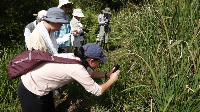 千葉県の高校で生物を教える教員の研究グループの生態教材研究班(通称:生態班)の研修が、下大和田で実施されました。 参加者は6名。短時間でしたが、水田・水路・湿原・草地・森林など多様な環境を巡りました。 今年は稲作を休止したので、水田ではガマの群落が繁茂し、カンガレイが大きく成長し、赤と白の花のミゾソバが群生していました。ハスやヒシ、コナギなども見られました。オオフサモかと思っていた水草がキクモだと教わりました。畦には、アライグマの足跡があちこちに見られます。特定外来種で駆除の対象ですが、徹底した根絶にはほど遠い状況です。 台地に登るとカラスウリの美しい実がたくさんぶら下がっていました。ヤマノイモのむかごを多量に収穫できました。まだヤブミョウガの白い花が咲いていて、紫色の実を実らせていました。クサギの臭いを確認しながら、美しいピンク色の花を愛でました。サンショウもたくさん実をつけ、爽やかな香りを楽しませてくれました。さわやかな秋の1日になりました。 生態班の研修会は今年2回目でしたが、私は、前回の研修に参加できなかったので、今回は現職の先生方にお会いできるのを楽しみにしていました。しかし、現職の方は、残念ながら2名のみでした。学校現場の多忙さが推察されますが、生物教員が、野外に出て自然界の生物を見たり触ったり、調査したりする機会が減少しているだろうことを危惧しています。是非、生物を教える立場の先生方、野外に出て動物の足跡を見たり、植物のにおいを嗅いだり、その実を食べたり、五感を総動員して自然を味わっていただきたいです。 参加者6名(大人6名) 報告:高橋久美子