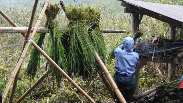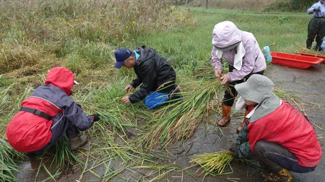 あいにくの雨と急な冷え込みの中、久しぶりの古代米の稲刈りをしました。場所は畑の近くの復田です。この日、参加したのは7人の少数精鋭メンバー。分業しながらサクサクと作業が進みます。深い泥に足を取られながらも、次々と稲を刈り取り、赤いボートに乗せて斜面の上まで引き上げました。今回は高低差のある田んぼだったので、人も道具もいつも以上に行き来が大変でした。 刈り取った稲はすぐに束ねていきましたが、雨に濡れていて赤米と黒米の違いがいつもより見分けにくく、「これはどっち?」と言い合いながら作業を進めました。稲束を一輪車に乗せてまとめて運び、オダがけ場まで一気に移動。バケツリレーのように手渡しながらオダがけをし、最後にスズメよけのネットをかけて無事に作業が完了しました。 小さな田んぼにしては思ったよりたくさん収穫でき、「これなら餅つきもできそう!」とみんなで喜びました。さらに、かやねずみの巣を5個も見つけて、ほっこりと癒される一日となりました。  参加者7名(大人7名) 報告:岩上由香利