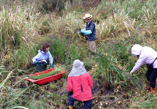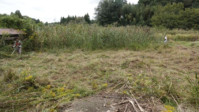 <旧マイ田んぼの草刈り> かつてマイ田んぼとして利用していた場所を、地権者のご理解が得られ、田んぼとしてお借りできることになりました。しかし、2年間使われなかった田んぼは、かつての姿が想像つかないほどアシやガマ、コブナグサ、ミゾソバなど様々な植物に占領されていました。そのためこの日、刈り払い機4台で草刈りをしました。 田んぼだったところなので、足場が悪く草刈りは楽ではありませんでした。途中から、ボランティアで来てくれた若いお二人が来てくれて、刈り取った草の片付けをしてくれました。刈取っとった草の除去も重要な作業です。その後、森の手入れをしていた人たちも来てくれて、全員参加の作業となりました。 報告 平沼勝男    参加者11名 (大人9名、大学生1名、小学生1名)