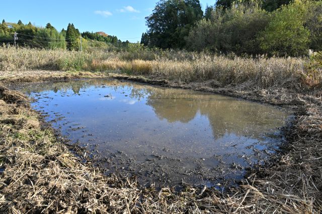 秋晴れの下、復田作業をしました。あいにく複数の体調不良者があり、少人数での作業となりました。 作業前に北側の水路の確認をしました。水路の形態はとどめていましたが流入する水の量が少なく、心配な面があります。次回は上流部の確認が必要と感じました。 復田作業は、田んぼの表面にひたひたの水が見えたので十分な水があると思い、ポンプなしで行いましたがこれが失敗。水の力なしで泥の中からアシや稲の根を取り出すのは結構大変でした。この失敗を次回から生かします。 作業後に地主さんのご自宅へ挨拶に伺いました。             参加者5名(大人5名) 報告 平沼勝男