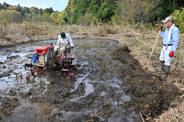 11月も後半になりましたが気温は20度近くあり、冬が遠く感じる陽気でした。しかし森では紅葉が始まっていました。 この日の作業内容は復田です。来年は少しでも下大和田でお米つくりがしたい、その一念でこの日から始まる復田作業を計画しました。毎月1度か2度、少人数でも少しずつ復田をする計画です。そのため初回のこの日は強力な助っ人に来て頂きました。千葉市緑区で農業をされている熊手正幸さんです。軽トラックに耕運機を乗せて来て頂きました。 熊手さんが来る前に復田予定地を刈り払機で草の除去をしました。そしていよいよ耕運機が田んぼに入りました。以前仲間とスコップと鍬で耕しましたが、深い泥の中では重労働で大変きつかったです。しかしさすがに機械の威力はすごいです。あっという間に耕しました。しかしあともう少しというところで機械が深い泥にはまってしまい、この日はこれで終了。作業終了後、熊手さんにアドバイスを頂きました。 我々のお米つくりは新たな展開になったとともに、来年のお米つくりの展望が開けました。            参加者14名(大人10名、大学生2名、幼児1名) 報告 平沼勝男