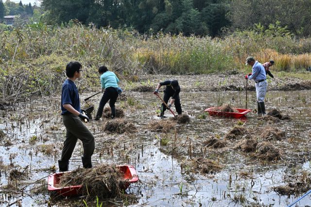 谷津田は紅葉が美しい季節になりました。雲の多い日でしたが、青空に緑・黄・赤の色合いが映え、見る目を楽しませてくれました。 前回のマイ田んぼの復田作業は、植物に覆われていたのを刈払機で刈りました。そしてこの日は田んぼに戻す作業、つまり水を入れて耕す作業です。しかしこれが大変な作業でした。地中にはヨシやガマ、ムツエオレグサ、ミゾソバ等の根がしっかり残っています。根は深く、隅々まで入りこんでいます。これを除去又は粉砕する必要がありますが、我々の力では到底無理なので農家の方に助っ人をお願いしました。耕運機による作業です。 しかしすぐ耕運機が入れるのではなく、まだ残っていた表面の寝ている草や、刈り取った草の除去を全員が人力で行いました。特に厄介だったのはムツオレグサで、厚く、固く、広く、根も張っているため複数人が協力しての除去でした。まるで厚いカーペットを地面から引きはがし、クルクル巻いていくようなやり方で、大変労力を使いました。 耕運機も最初は草や根が多く、深く耕せません。同じ場所を何度も何度も繰り返し回り、少しずつ深く耕すのです。午前中で終わらせる予定でしたが、甘かったようで、午後も作業を続けました。2枚の田んぼを耕しましたが、まだ完成に至りません。あと何回か、同じように耕運機を回す必要があります。 午後からは並行して、今年収穫されたお米(古代米)の脱穀作業をしました。脱穀機は順調に動いてくれました。山の手入れではオニグルミの種を植えました。草刈りもしました。 報告; 平沼勝男