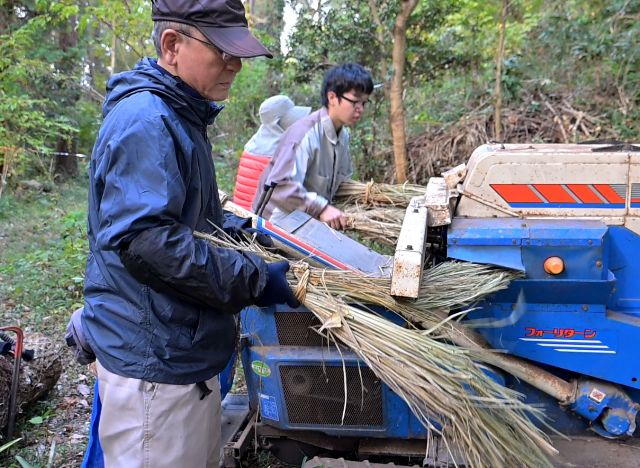 森と水辺の手入れ「観察路の整備と旧マイ田んぼの草刈り」&第312回下大和田YPP「古代米の脱穀」 2025年11月16(日)晴れ