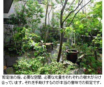 樹形や大きさを維持するために庭木の枝を切り詰めることを剪定といいます。庭における剪定の必要性は何か。それは庭という限られた面積の中で様々な種類の樹木草花を共存させるために、庭全体のバランスを考えながらそれぞれの樹木の成長を抑制すること、あるいは繁茂した枝葉を透かすことによって、低木草花の生育に必要な日照を庭の下部にまで誘導するために行います。