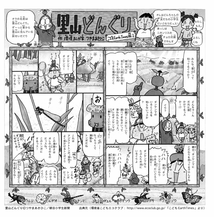 ちば環境情報センターに入会して今年で10年、また、会社員時代に日本全国で莫大なゴミに直面し、環境漫画家を志して10年目の節目でもあり、日ごろ下大和田の谷津田などでいろいろご教授頂いたお礼も兼ねて、以下の環境省「こどもエコクラブ」のニュースレターで連載している里山漫画を掲載させて頂きます。