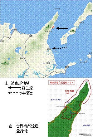 知床半島に入ると風景が一変します。進行方向の左側が山、右側が海。途中の休憩で浜辺に立ちますと眼下には美しい海、そして海の向こうには国後島が見えます。ここは海峡になっているのです。地図をご覧ください、大きな湾が国後島を包み込むような形になっています。そして北から寒流である親潮が入ってきます。親潮は遥かロシアの大地を流れる大河アムール川の水を多く含みます。そのためこのあたり東部沿岸およびオホーツク沿岸は流氷が来る世界最南端の場所です。 何年か前に流氷が来ない年がありました。 するとその年の春のホタテが大不漁になったことがありました。 流氷は豊富な栄養塩を運んでくれる、それでプランクトンが増え、豊かな水産資源が育つのです。 羅臼で水揚げされる代表的な水産物はアキサケ、カラフトマス、スケトウダラ、マダラ、ホッケ、コマイ、キチジ、各種カレイ類、タラバガニ、スルメイカ、ドスイカ、ブドウエビ、昆布、バフンウニなどなど。回遊魚から底性生物、魚はもとより軟体動物、甲殻類、海藻類と多岐にわたります。海峡の中央部は深度があることも種類を多くしている要因になっていると思います。