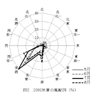 さっそく見てみますと、図1は、2010年の春・秋・冬の風配を、図2は夏の風配を示しています。図1では北北東、北北西の風が優勢、図2では集中して南西方向からの風が吹いていることがよくわかります。