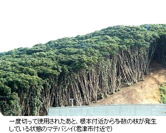 江戸の末期頃から昭和の前半期にかけて、南房総に植え続けられたこの樹は、薪炭材としてのほかに、たとえば富津市海岸での海苔養殖のソダヒビ、天津小湊町のサバ節の燻乾材、富浦町のビワの防風垣、白浜町の漁具材など、多方面に利用されて来た。