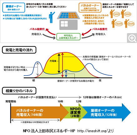 例えば日当り抜群の上田市のAさんがパネル設置をする時にスペースが余るので、他の方が相乗できることになり、千葉からわたしも設置費用を出してパネルを相乗りさせてもらったとします。Aさんは昼間の電気は自分のパネルの発電分から使用するので、相乗り分は全量を売電できます。私は、実際にその電気を使うことはできないけれど、毎月売電収入を得ながら社会に自然エネルギーを増やすこができます。