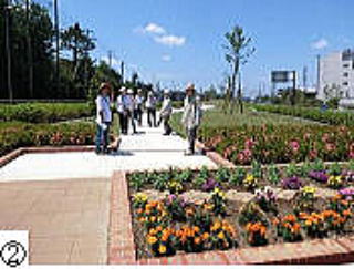 緑地は広いのですが残念ながら高木が少なく、歩行者はもっと緑陰が欲しいのではと感じました(写真①)。また広い花壇には一年草が植栽されていました(写真②)が、今後は手入れが少なくてすむ宿根草や球根にするなど、工夫も必要ではないでしょうか。日陰の植栽マスにはクチナシが密植され、そのほとんどが枯死していました。環境にあった樹種の選定が必要です。