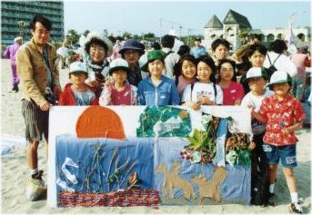 松林を抜け、海岸を一面に見渡せる丘に出た時、その不安はより大きなものに。期待に反して松林では面白い物に出会えず、メンバー(なぜか子どもばかり)の表情も今一つ。果たしてうまく作品にまとめ上げられるのだろうか。浜へ戻り、メンバーの感じたことを発表してもらうが、作品につながりそうな言葉がなかなか出てこず、どうしたものかと焦りを感じながらどんな絵を作るか意見を聞く。海・砂浜・ラクダと具体的なものはでてきたが、何か物足りない。そんな中、「海の中に島があって、その中にジャングルがあればいいな」とのアイデア。「本当はないけれども、こんなものがあったらいいな。」というアイデアに感心し、内心「やったぞ」と思う。これがきっかけで、グループ全体に元気が出てきた。全体のイメージもまとまり、いよいよ布絵作り。素材選びや、イメージをうまく表現するのに手間取ったりしながらも、なんとか作品が仕上がりほっと一息。橋の欄干に掛けられた作品を見たときには、不安と焦りが満足感に変わっていた。