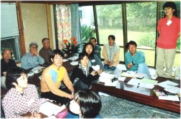 昨年のワークショップの参加者が半分、新しい参加者が半分、計22名。初めて会う人、いつも一緒に活動している人、谷津に詳しい人、植物に詳しい人、様々な分野で活動している人々が集まり、自己紹介にとどまらず他個紹介も入り、賑やかに興味深くワークショップはスタートしました。その後、数人の方に昨年の活動報告と、活動していく上での問題点、課題も話していただきました。 明けて3日、早朝の浜辺のデート「浜辺のあしあと物語」として、朝の海を楽しみ、朝食後ワークショップ「提案、自分のやりたい活動への助っ人募集の呼びかけ」が始る。今後どんな活動をしていきたいかを出し合い、共通するテーマに別れてグループになり実践案「何をやるか、どのようにやるか」を作成しました。各自の活動内容に微妙な違いはあるものの接点を見つけて、実のある実践計画が出来上がりました。活動するフィールドは様々であっても活動しようとする情熱は参加者すべての人に共通であることを実感しました。