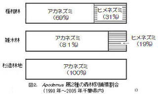 千葉県には、山地がありません。だから、アポデムス指数を左右する要因として、標高(気候)を気にしなくてすみます。千葉県内で,私が捕獲したアカネズミとヒメネズミについて,森林の種類ごとに割合を求めると,図2のようになります。アポデムス指数は,千葉県の森林について,それぞれの自然度を示すものさしになります。