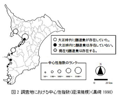明治~昭和初期の調査地の中心性指数(商業施設による経済規模)は、醸造業(酒、醤油等)が存在した沿岸都市(◯)では、中心性指数のランクの高い傾向がみられたことから、開発前においては、醸造業が経済規模に大きく影響していたと推察される(図2)。