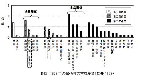 幕張町の主要産業をみると、第二次産業では、醸造業(酒、醤油等)、貝灰製造と海岸砂丘や海の資源を活用した産業が発達し、1つの「まち」で生活必需品が揃い、独立していた(図3)。また、図の掲載はないが、検見川町、八幡町でも同様であった(松井1929)。