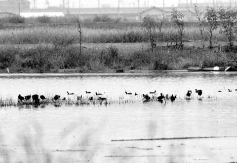 ![]() 市川市妙典の蓮田・通称オオバン池とオオバンの群 奥に江戸川放水路の堤防が見える 1974年8月15日 撮影:田中正彦 |