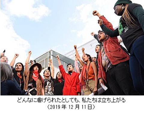 会場外に追い出され、会場警備の抑圧的な態度が強く感じられる中であっても、人々は動じずに声を発し続けました。人々から発せられたのは、気候危機を回避するためには社会的公正の実現が不可欠であること、女性への不公正や姉妹が受けた暴力への怒りと悲しみ、先住民族が代々管理してきた土地・森林・水が利益のために奪われつつある現状、未来への危機感、そしてそれでも立ち上がるという市民の歌でした。そして「ここで発せられている言葉は、世界で苦しむ何百万もの人々を代表している」と口を揃えました。