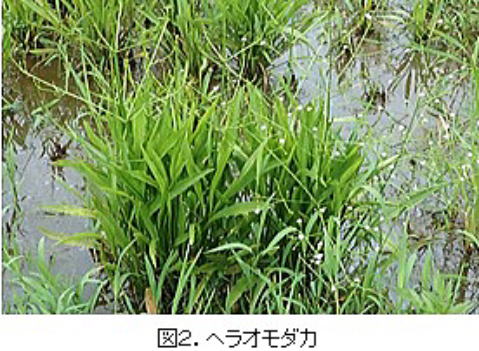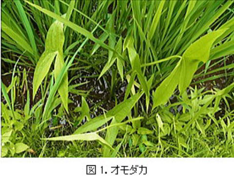 オモダカは典型的な水田雑草です。矢尻形の葉が特徴で、高さ50㎝ほどにも生長します(図1)。夏には白い花が開花し結実します。
