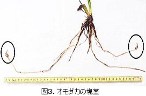 秋になると、オモダカは根際から細い送出枝を伸ばして先に塊茎を形成します(図3)。冬には植物体の本体は枯れて消えてしまいますが、塊茎だけは地中に埋もれて越冬し、春になると芽を出します。塊茎は地下10㎝ほどの深さにあるので除草剤では退治できなくて、そのため強害草といわれるのです。